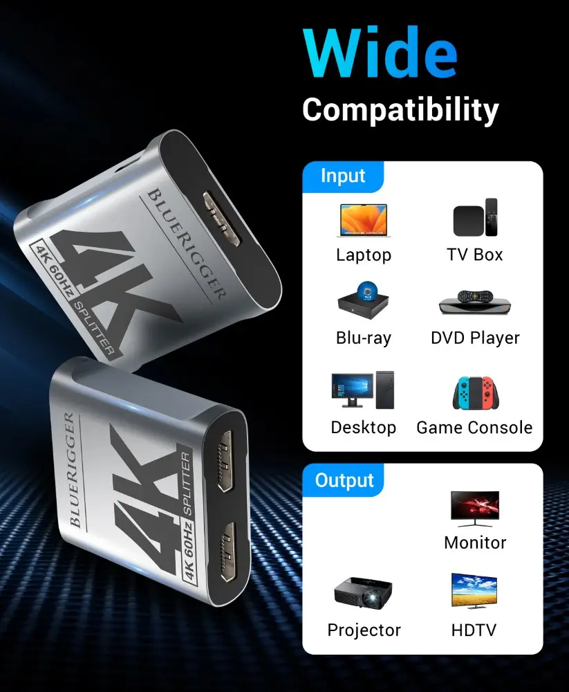- The BlueRigger 4K HDMI splitter comes with 1 HDMI input and 2 HDMI outputs