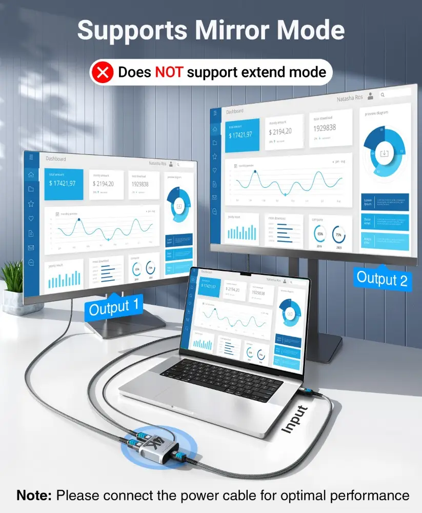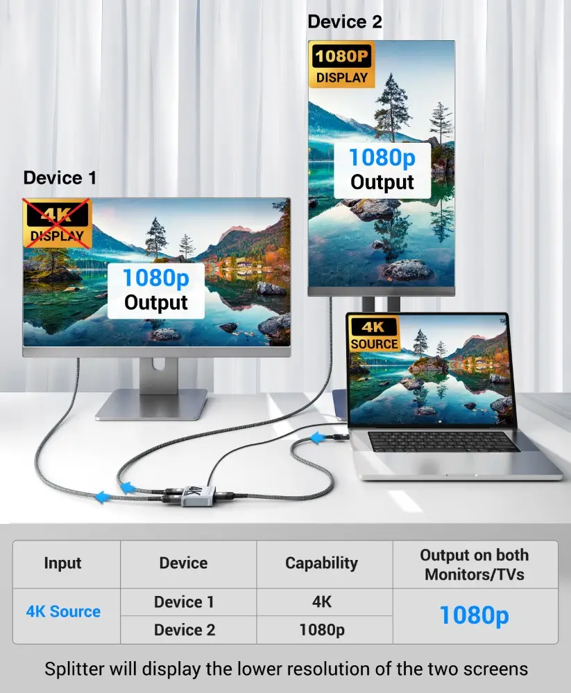 For example, if one display is 4K and the other is 1080p, then the splitter will display content on both screens at 1080p resolution.