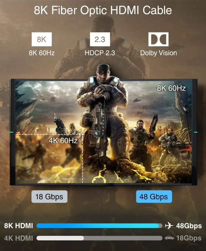 An Optical 8K HDMI AOC cable carries 48Gbps speeds, unlike regular HDMI, which struggles to maintain signal beyond short lengths.
