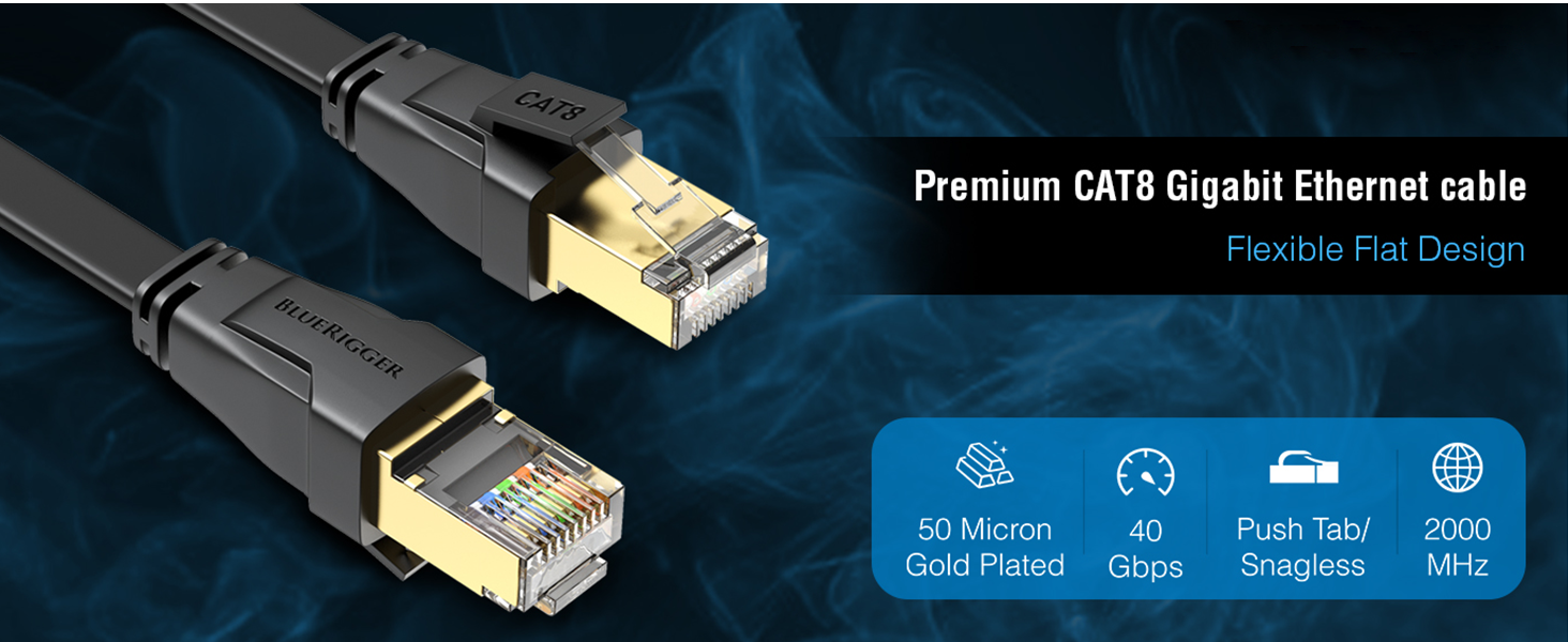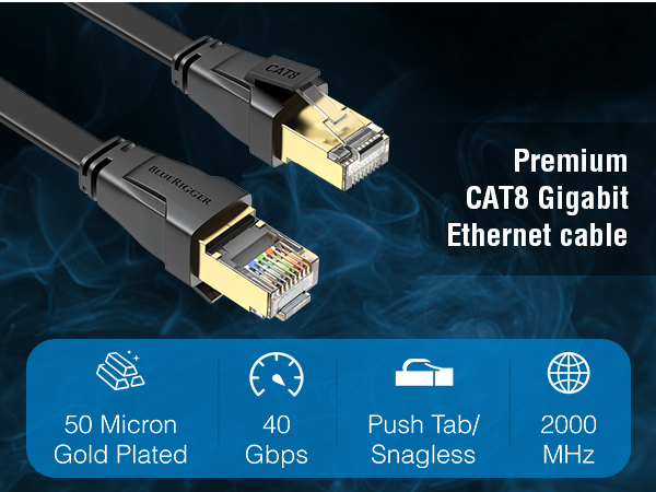 BlueRigger Cat8 Flat Ethernet Cable is the right choice for those who want a High-performance Ethernet cable built to handle large file transfers without compromise. It delivers blazing speed up to 40Gbps and bandwidth of 2000MHz. It is designed for gamers, streamers, and professionals.