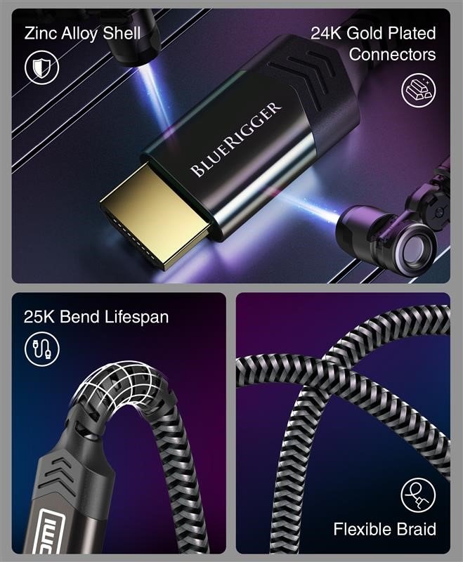The BlueRigger 8K HDMI Braided Cable allows for high-definition performance, supporting 8K at 60Hz and 4K at 120Hz. 48Gbps, HDR10, Dolby Vision, eARC are supported by the cable, providing silky smooth visuals with a stellar audio performance! Its robust braided nylon design offers tangle-free flexibility and longevity. Compatible with gaming consoles, Apple TV, and more. This high-speed HDMI 8K braided cable guarantees a flawless streaming and gaming experience. Backed by a lifetime warranty, it’s the best choice for reliable, premium-quality connections in your home entertainment setup.