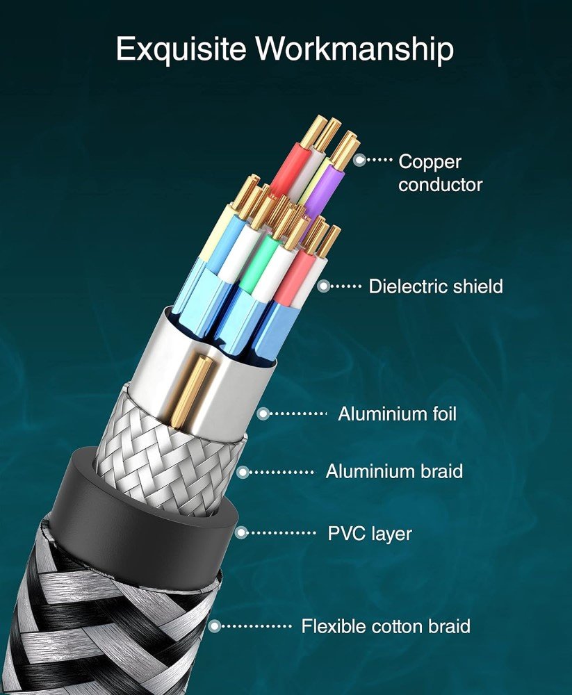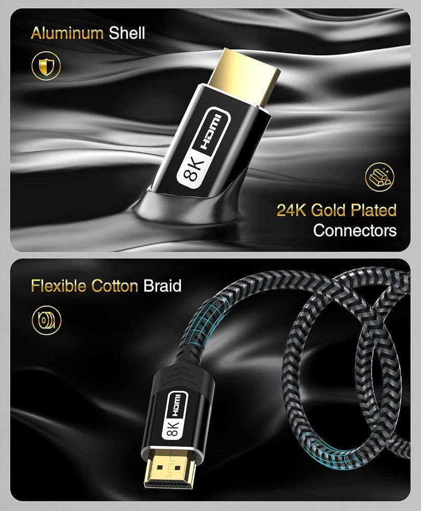 An HDMI 8K braided cable supports 8K@60Hz and 4K@120Hz and has the best bandwidth of up to 48Gbps and tackling things like a rugged braided design, as opposed to the standard PVC cables, which inherit slower speeds.