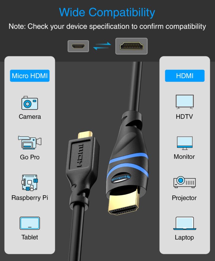 Our BlueRigger Micro HDMI to HDMI cable is the ultimate cord built with premium quality material specially crafted for all the gamers, content creators, tech enthusiasts, and bloggers. You can seamlessly connect your Micro HDMI device, like GoPro, Raspberry Pi, and Sony cameras, and transfer video, images to another device with an HDMI port.
