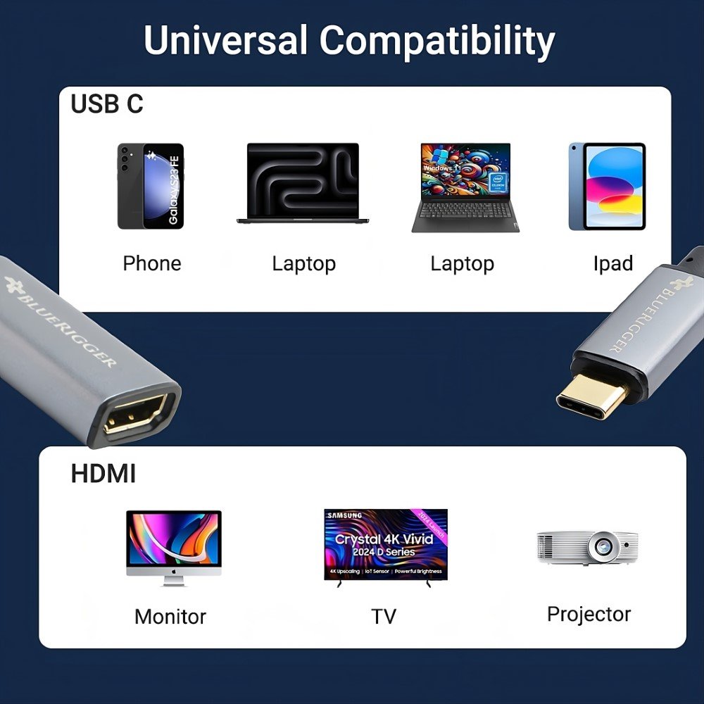 BlueRigger has brought you a smarter way to connect your device with this premium Type-C to HDMI Female Adapter that lets you enjoy lag-free streaming, vibrant colours, and reliable connectivity. This Adapter is compact, durable and comes with no installation chaos. You can buy this smart next-gen USB-C to HDMI Female Adapter to simplify the digital setup, compatible with Thunderbolt 3.