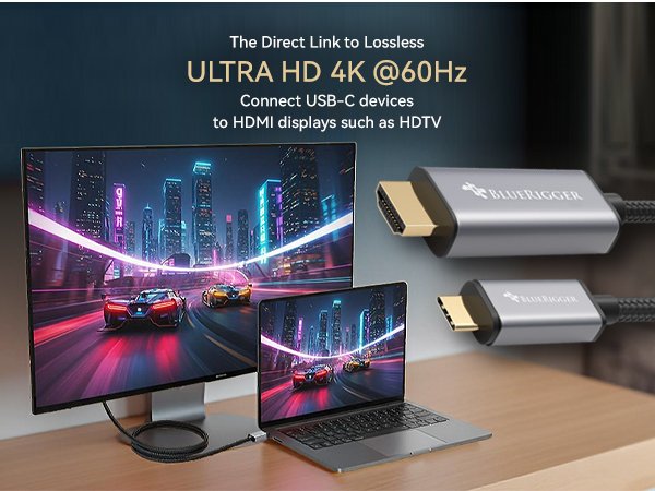 Step into the future of technology with the BlueRigger USB Type C to HDMI adapter which let you connect lets you connect your laptop, tablet, or Thunderbolt device to any HDMI display effortlessly. We are committed to delivering ultimate technologically advanced and highly durable products. This cable is a brilliant solution for those who seek to connect their devices with Type-C ports to HDMI displays. It supports highly sharp, detailed, and colour-rich visuals up to the resolution of 4K. It is also backward compatible with previous version devices.